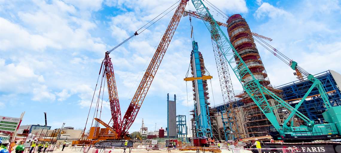 The 16 steam generators that the Demag CC 3800-1 lifted were 28 m in length and weighed up to 80 tonnes. They were lifted to a height of just under 60 m at a radius of 40 m. To do this, the Al Faris team used an SWSL configuration with a 48 m main boom, a 36 m fly jib, and a Superlift counterweight of 165 tonnes with a radius of 11 m.