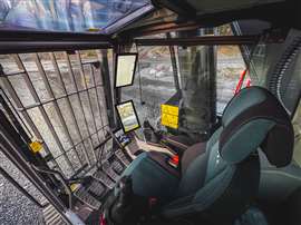 The cab includes roll-over protection and frame-mounted Falling Object Guards. 12mm thick single-piece impact resistant glass provides excellent visibility and protection. New controls, like an electric joystick and travel pedal, enhance comfort and precision.